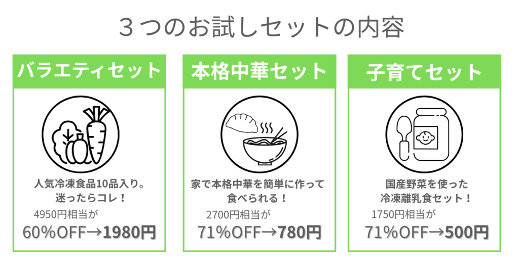 お試しセットとは1世帯1回限り、コープデリに入会していない方だけが対象です。お試しセットは3種類の中から選べます。