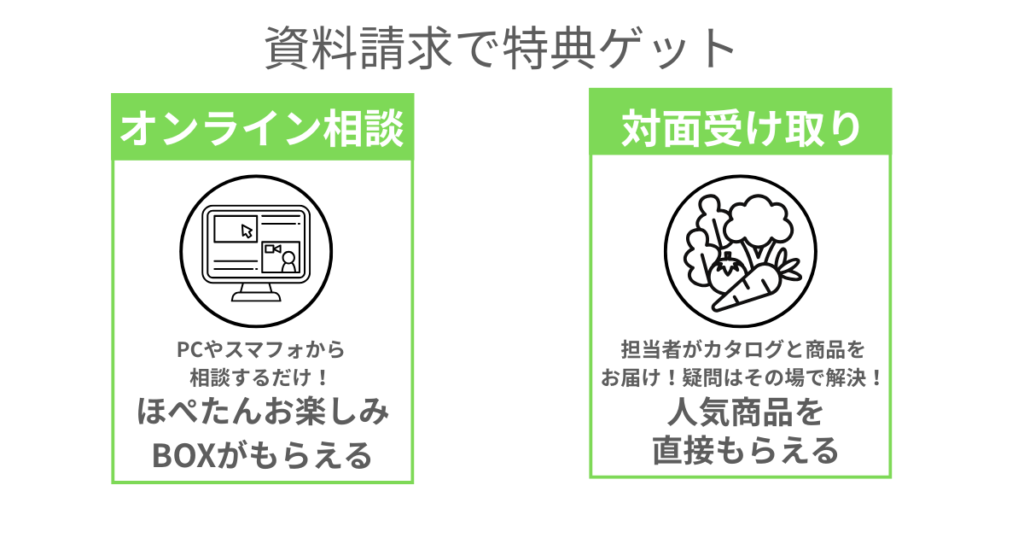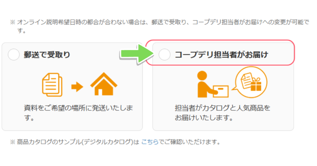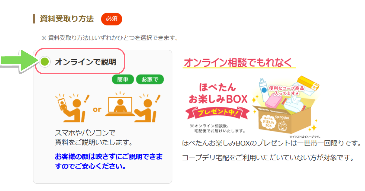 オンラインでコープデリの担当者と資料を見ながら説明を受ける方法とコープデリの担当者が訪問し資料と一緒に直接届けてもらう方法です。