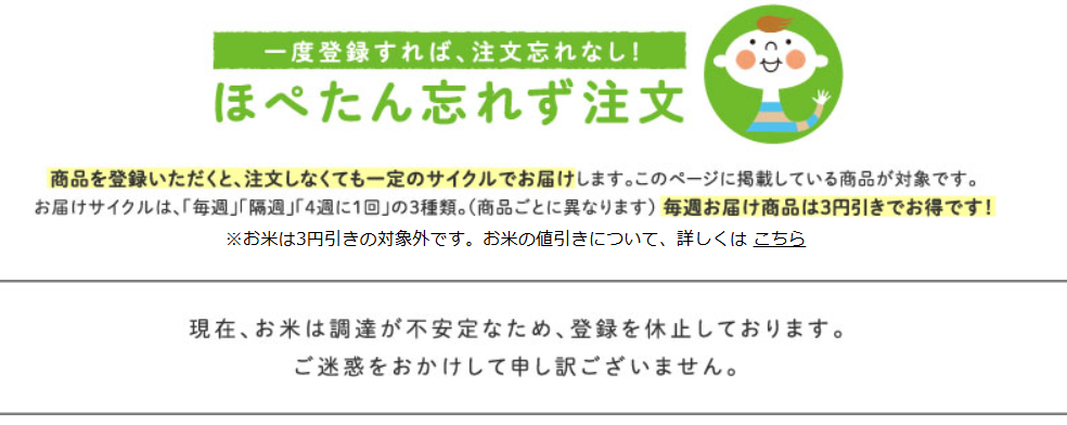 ほぺたん忘れず登録とは希望商品を登録すると1週間や隔週など一定のサイクルで自動注文できるサービスです。