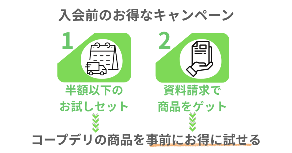 コープデリでは加入前に半額以下でお試しできる限定キャンペーンがあります。加入前にしか試せないので、コープデリの商品をお得に試しましょう。一番安いセットでは500円のワンコインで買うことができます。