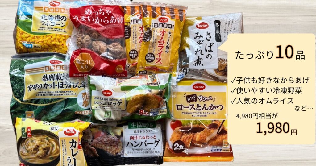 コープデリの人気冷凍食品10品入り。メインのおかずから冷凍野菜まで入ってコープデリの商品を網羅できる総額4,950円のセット。