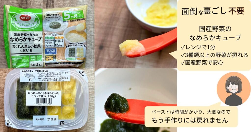 離乳食初期から使える食材は国産野菜を裏ごしした冷凍ペーストがあり、手作りだと手間がかかる工程をカットできます。