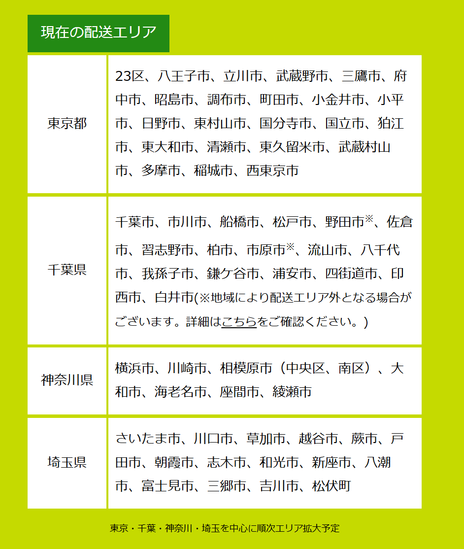 まだ、配達地域が1都2県の一部のみと狭い地域となっています。今後順次拡大予定となっているので、お住まいの地域が対象になるのを待つ必要があります。